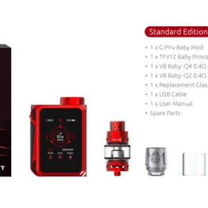 SMOK G-PRIV Baby LUXE 85W Starter Kit is the latest engineering marvel in a compact form factor, presenting a stunning touch screen device with an 85W chipset and full temperature functionality to pair with the TFV12 Baby Prince Tank. Maintaining the luxurious and prismatic designs of the G-PRIV 2 LUXE, the G-PRIV Baby 85W delivers elaborate elements with superior quality frame chassis and high-gloss finish for a high-end impression. The structure maintains a classic vertical-based design with sharp angular lines centered around the large 2″ OLED Full-Color Touch Screen with upgraded UI (User Interface). New to the G-PRIV Baby LUXE is the utilization of a single 18650 battery (sold separately), accessed via a threaded battery top cap for ergonomic design. Pairing with the G-PRIV Baby is the TFV12 Baby Prince Sub-Ohm Tank, implementing a maximum capacity of 4.5 milliliters, new button-lock hinged top-fill, smooth dual bottom airflow control, and the utilization of the TFV8 Baby Coil System.