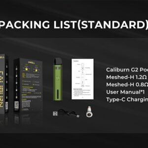 Uwell Caliburn G2 Pod System, featuring a 750mAh battery, 18W maximum output, and can hold up to 2mL of eJuice in the refillable pod. Constructed from durable aluminum alloy, the chassis of the Caliburn G2 offers a lightweight and portable form factor, while encapsulating a large 750mAh battery within. Operating off a dual firing mechanism, the Caliburn G2 can utilize a button fire or draw-activated firing mechanism to deliver silky smooth vapor and flavor from your favorite eJuice. Holding up to 2mL of eJuice within the refillable pod, the Uwell Caliburn G2 comes with a juice viewing window to reduce dry firing, and features an adjustable pod-based airflow control dial.